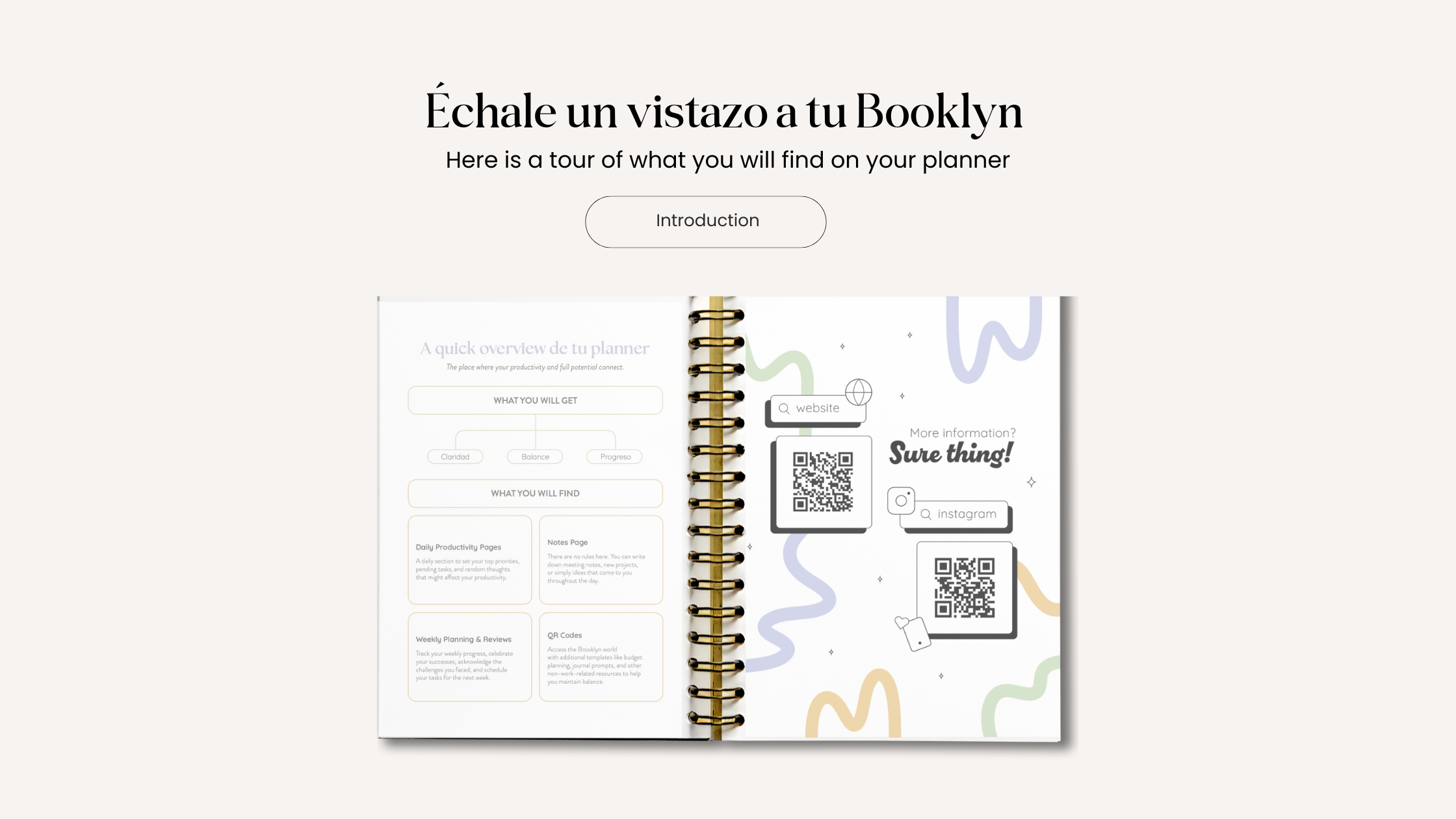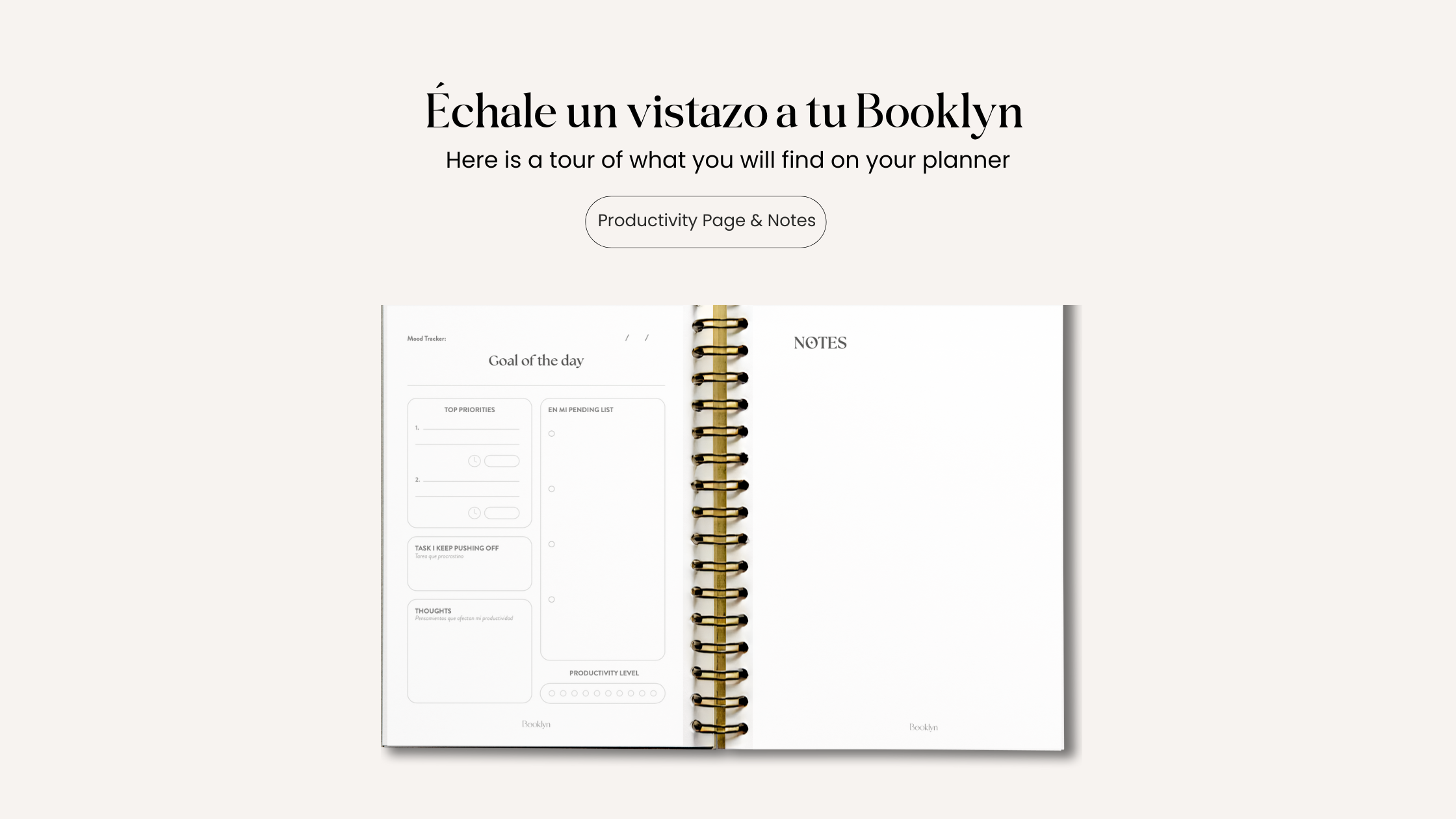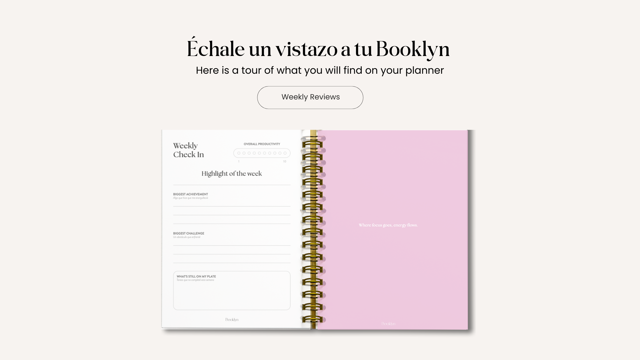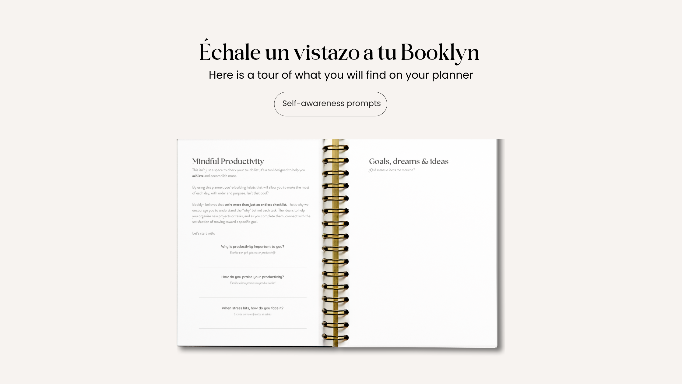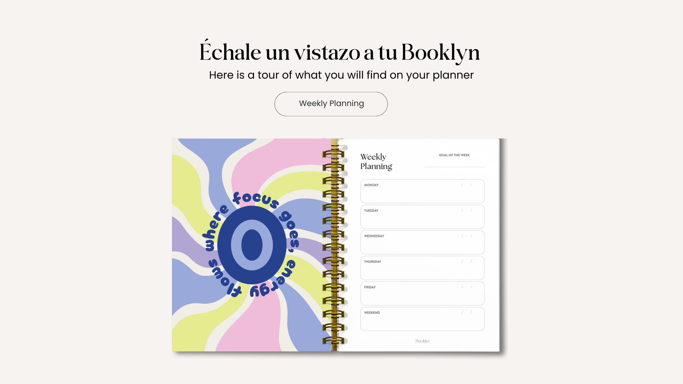 Booklyn is a quarterly planner that combines elegance with a bold, funky style. Designed to help you prioritize, track goals, and reflect, it features Spanglish prompts for those who appreciate a unique and personal touch in their daily routine.
